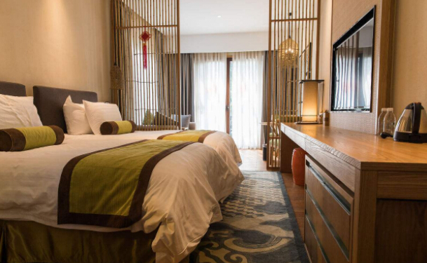 3、客房??头恐凶铌P頭的無疑是一張和緩舒適的大床了??头恐械乃械脑O計都要圍繞床來睜開。以床為核心設置設備放置床頭燈和簡略的桌椅。一個開閉柔柔空間夠大的衣柜可以放置參觀者的全數行李,也能儉仆室內空間。